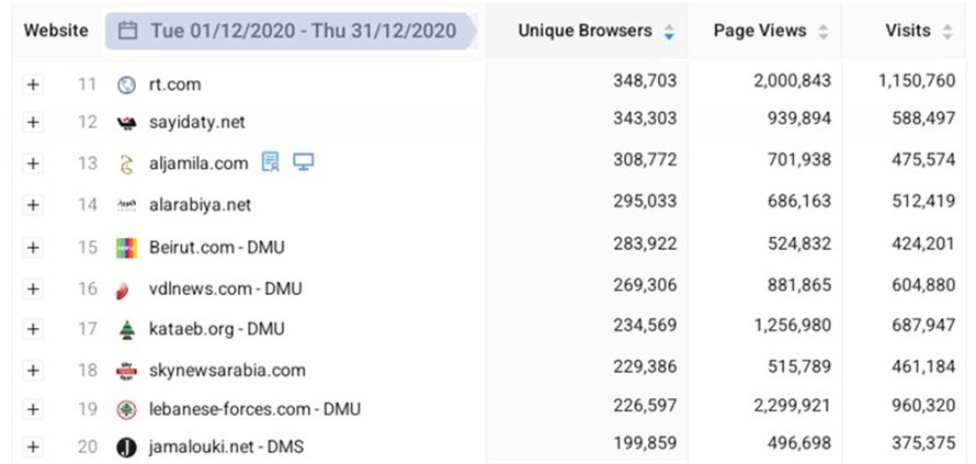 مرة جديدة أظهرت إحصائيات عالم المواقع الإلكترونية العاملة في لبنان والتي تنشرها شركة narratiive.com تصدّر tayyar.org المركز الاول، وتقدمه على كل المواقع الاخرى من كل الفئات، في شهر كانون الأول ٢٠٢٠. (راجع الجدول المرفق).