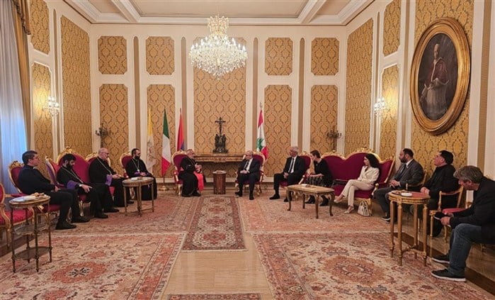 يستقبل في هذه الأثناء البطريرك روفائيل بدروس الحادي والعشرون ميناسيان، كاثوليكوس بطريرك بيت كيليكيا للأرمن الكاثوليك، دولة رئيس مجلس الوزراء الدكتور نواف سلام، في المعهد الحبري الأرمني في روما.