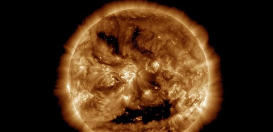 التقط مرصد ديناميكا الشمس التابع لناسا (SDO) صورة مذهلة للشمس في 28 تشرين الأول، تبدو فيها مثل يقطينة كونية متوهجة تبتسم للأرض من الأعلى، تزامنا مع الاحتفالات بالهالوين.