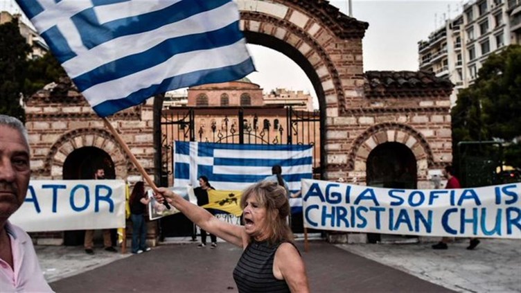 وكان الانتقاد اليوناني لتحويل الموقع الأثري شديدا على نحو أبرز توتر العلاقات بين البلدين. ودقت أجراس الكنائس حدادا في أنحاء اليونان أمس الجمعة بينما كان الرئيس التركي رجب طيب أردوغان يؤدي الصلاة ضمن حشود المصلين بالمكان.