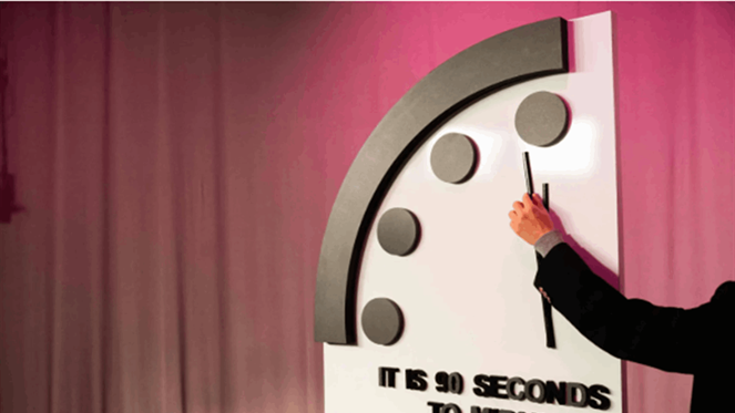 وهذا يعني أن خطر محو البشرية لنفسها من خلال حرب نووية أو الاحتباس الحراري العالمي أصبح الآن أكبر من أي وقت مضى منذ إنشاء الساعة. ويتم الإعلان عن الضبط الرمزي للساعة مرة واحدة في العام.