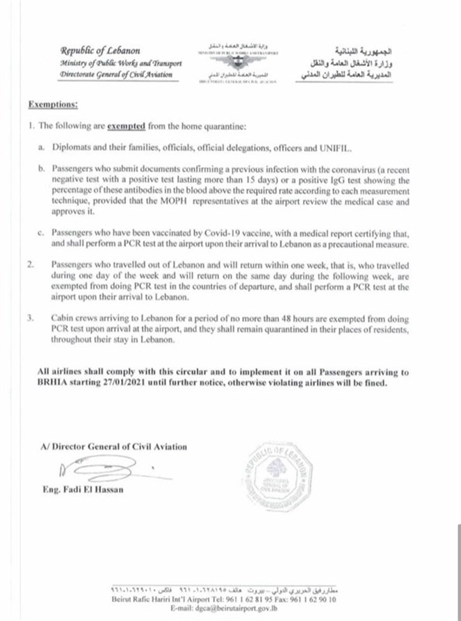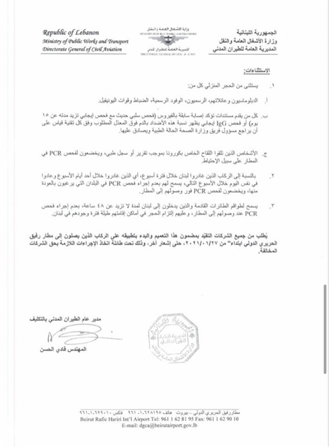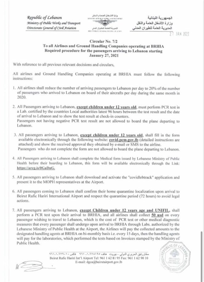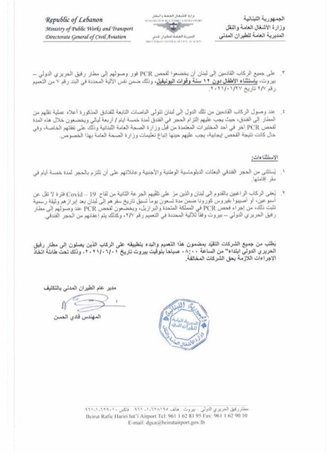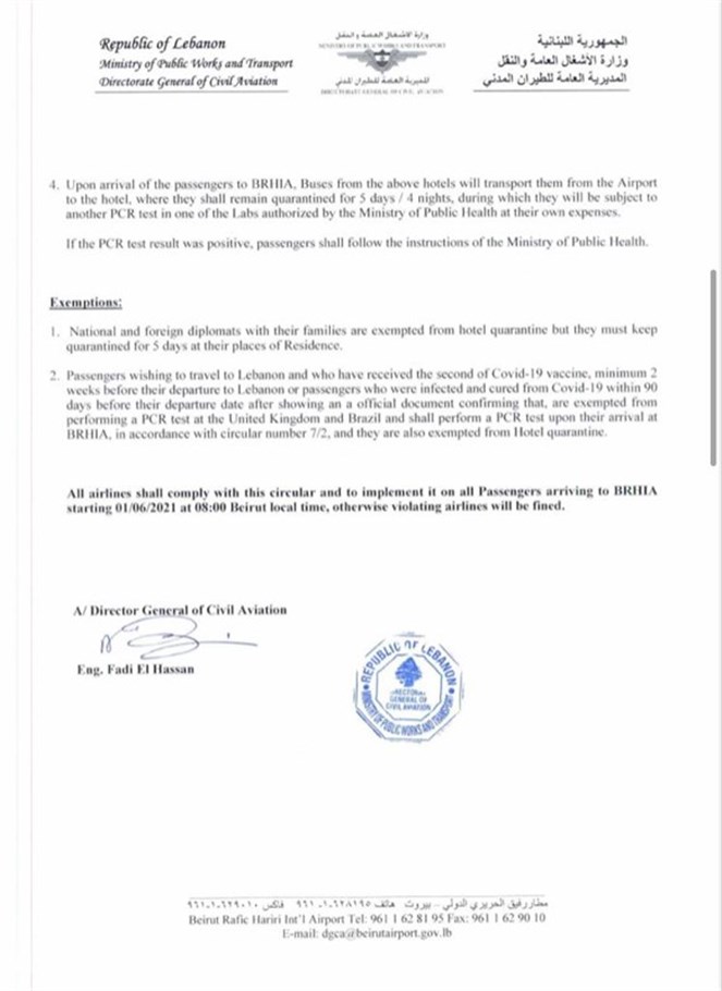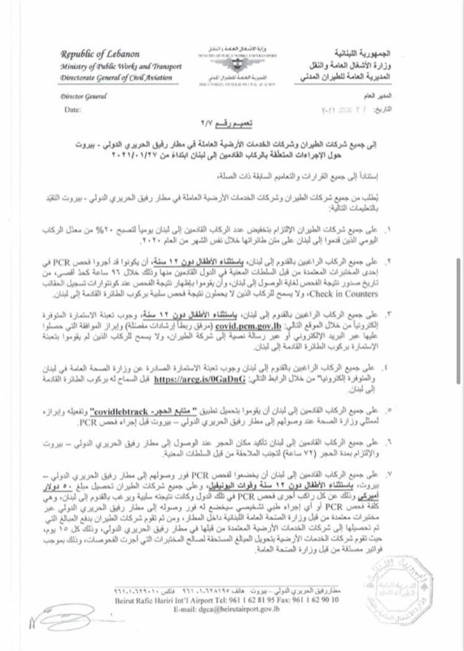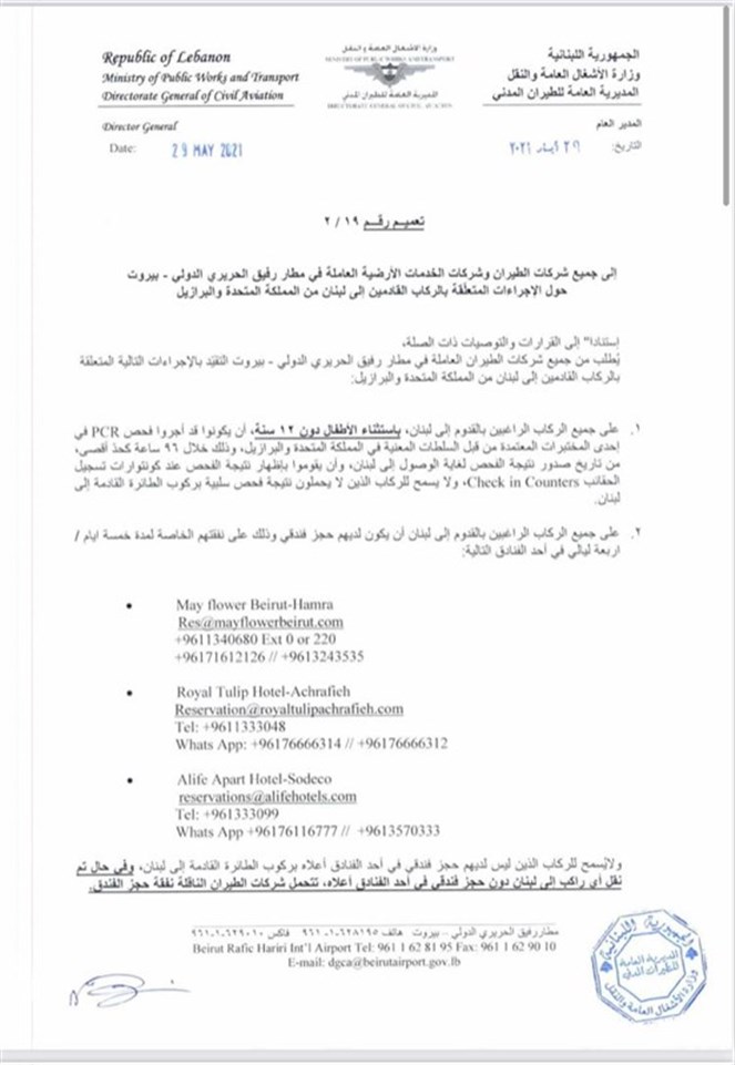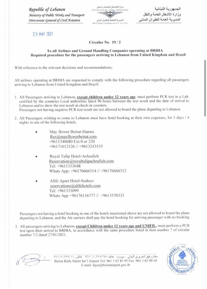 إجراءات متعلقة بالركاب القادمين إلى لبنان من المملكة المتحدة والبرازيل...