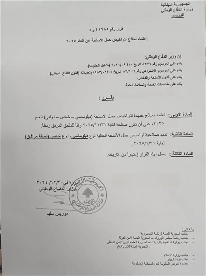 قرار هامّ من وزير الدفاع حول حمل الأسلحة..