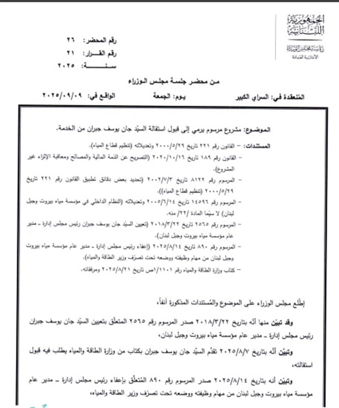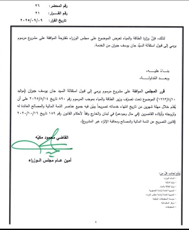 بالصورة - قرار عن مجلس الوزراء بقبول طلب استقالة المهندس جان جبران من الخدمة في القطاع العام